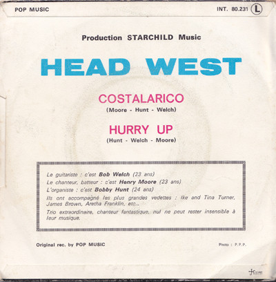 € 5.00 Media: Very Good Plus (VG+)Hoes: Very Good (VG)Head West – Pop Corn : Costalarico / Hurry Up (7″, Single)
