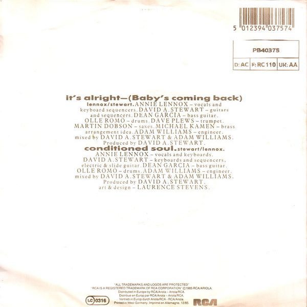 € 3.50 Media: Good Plus (G+)Hoes: Good Plus (G+)Eurythmics – It’s Alright (Baby’s Coming Back) (7″, Single)