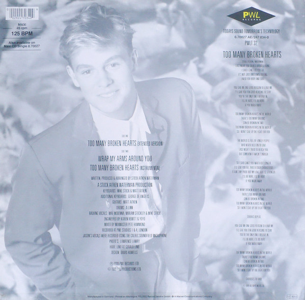 € 6.50 Media: Very Good (VG)Hoes: Very Good Plus (VG+)Jason Donovan – Too Many Broken Hearts (12″, Maxi)