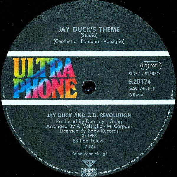 € 7.50 Media: Very Good Plus (VG+)Hoes: Very Good Plus (VG+)Jay Duck And J. D. Revolution – Jay Duck’s Theme (Long Version) (12″, Single)