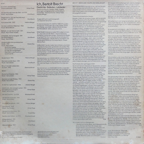 € 5.00 Media: Very Good (VG)Hoes: Very Good Plus (VG+)Bertolt Brecht – Ich, Bertolt Brecht (LP, Comp, Mono, Sil)