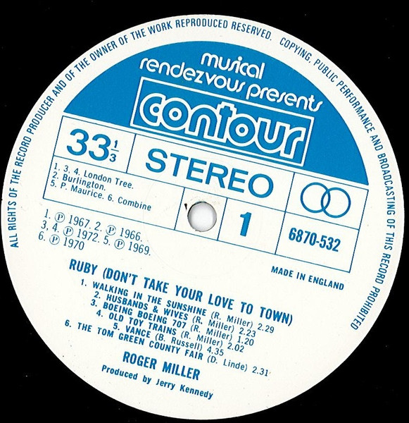 € 7.50 Media: Very Good Plus (VG+)Hoes: Very Good (VG)Roger Miller – Ruby (Don’t Take Your Love To Town) (LP, Comp)