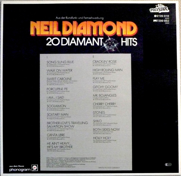 € 6.50 Media: Very Good Plus (VG+)Hoes: Very Good Plus (VG+)Neil Diamond – 20 Diamant Hits (LP, Comp)