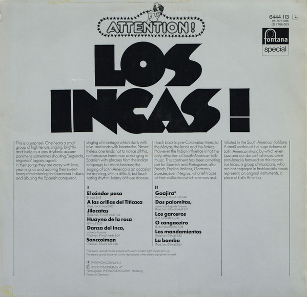 € 6.50 Media: Very Good Plus (VG+)Hoes: Very Good Plus (VG+)Los Incas – Attention! Los Incas! (LP)