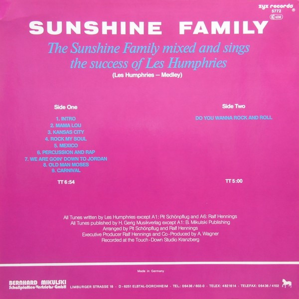 € 5.00 Media: Very Good (VG)Hoes: Very Good Plus (VG+)Sunshine Family – The Sunshine Family Mixed And Sings The Success Of Les Humphries (Les Humphries – Medley) (12″, Maxi)