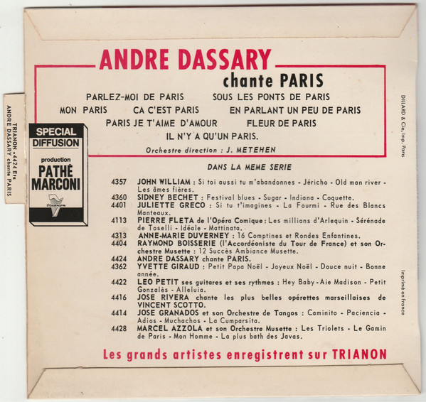 € 4.50 Media: Very Good (VG)Hoes: Very Good Plus (VG+)André Dassary – Chante Paris (7″, EP)