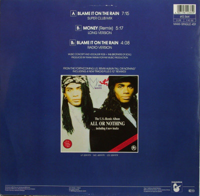 € 9.50 Media: Very Good Plus (VG+)Hoes: Very Good Plus (VG+)Milli Vanilli – Blame It On The Rain (12″, Maxi, Promo)