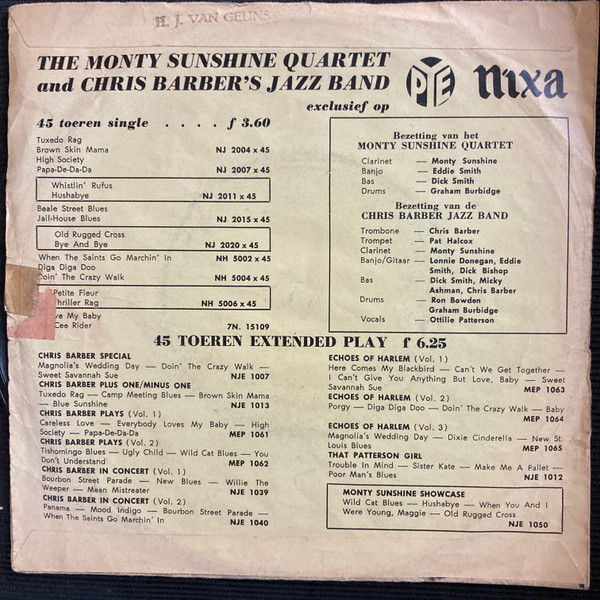 € 4.50 Media: Very Good Plus (VG+)Hoes: Very Good Plus (VG+)Chris Barber’s Jazz Band / The Monty Sunshine Quartet – Whistlin’ Rufus / Hushabye (7″)