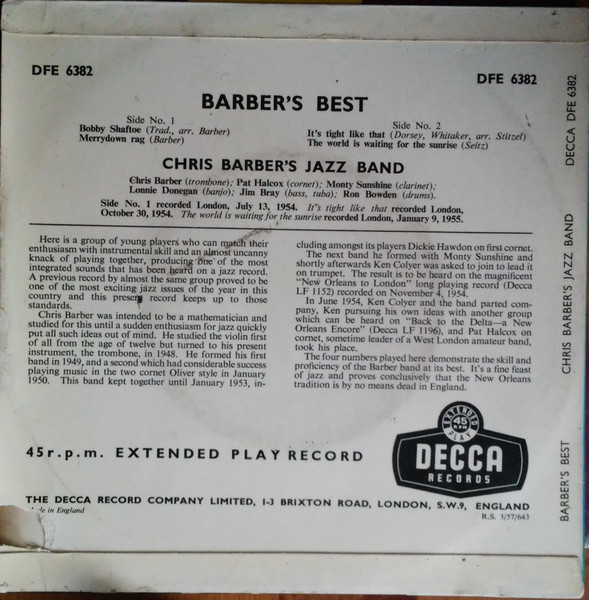 € 6.00 Media: Good Plus (G+)Hoes: Very Good (VG)Chris Barber’s Jazz Band – Barber’s Best (7″, EP, 3-p)