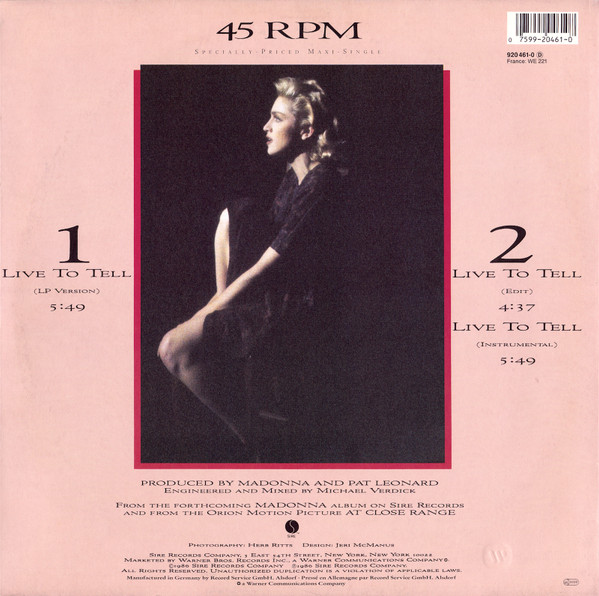 € 27.00 Media: Very Good (VG)Hoes: Very Good Plus (VG+)Madonna – Live To Tell (12″, Maxi)