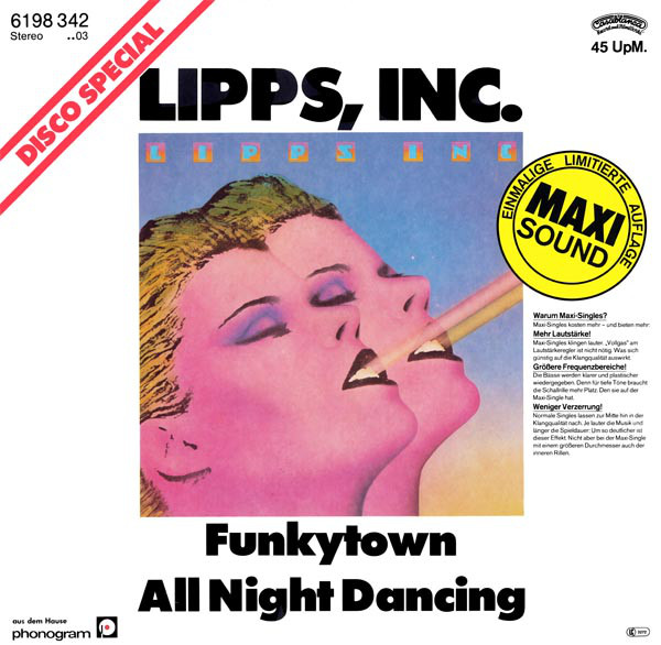 € 6.50 Media: Very Good Plus (VG+)Hoes: Very Good Plus (VG+)Lipps, Inc. – Funkytown / All Night Dancing (12″, Maxi, Ltd)
