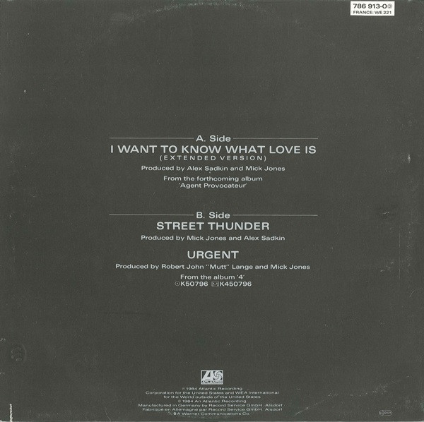 € 3.50 Media: Good (G)Hoes: Very Good (VG)Foreigner – I Want To Know What Love Is (Extended Version) (12″, Maxi)