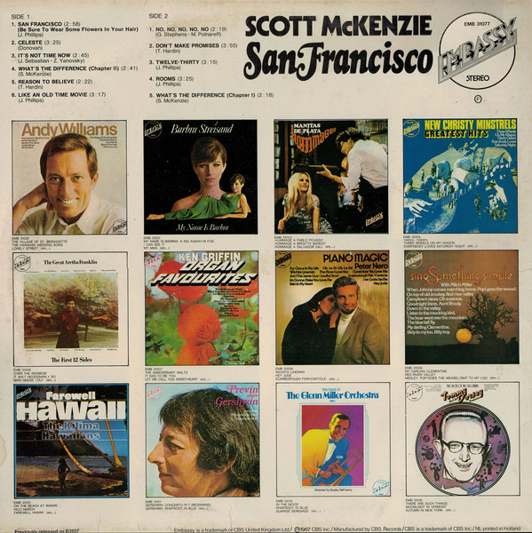 € 7.50 Media: Very Good Plus (VG+)Hoes: Very Good Plus (VG+)Scott McKenzie – San Francisco (Be Sure To Wear Some Flowers In Your Hair) (LP, Album, RE, Blu)