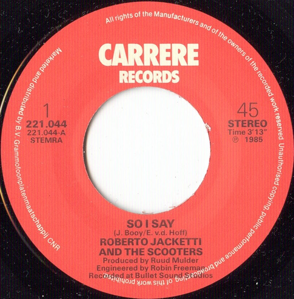 € 6.00 Media: Good Plus (G+)Hoes: Very Good Plus (VG+)Roberto Jacketti & The Scooters – So I Say (7″)