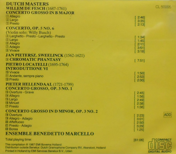 € 6.50 Media: Very Good Plus (VG+)De Fesch* / Sweelinck* / Locatelli* / Hellendaal* – Ensemble Benedetto Marcello – Dutch Masters (CD, Comp)