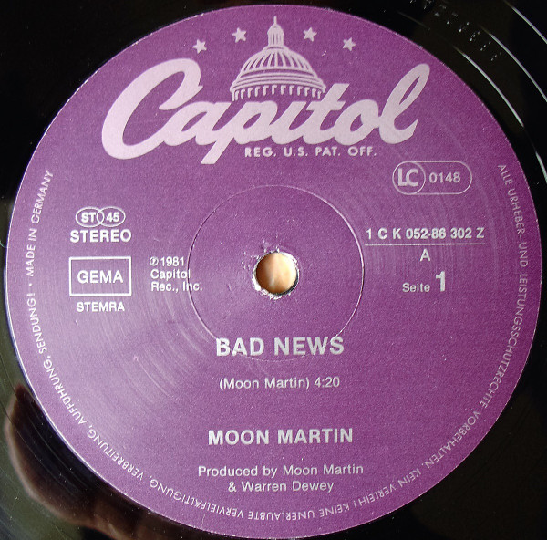 € 4.50 Media: Good (G)Hoes: Good Plus (G+)Moon Martin – Bad News (Special Version) (12″, Maxi)