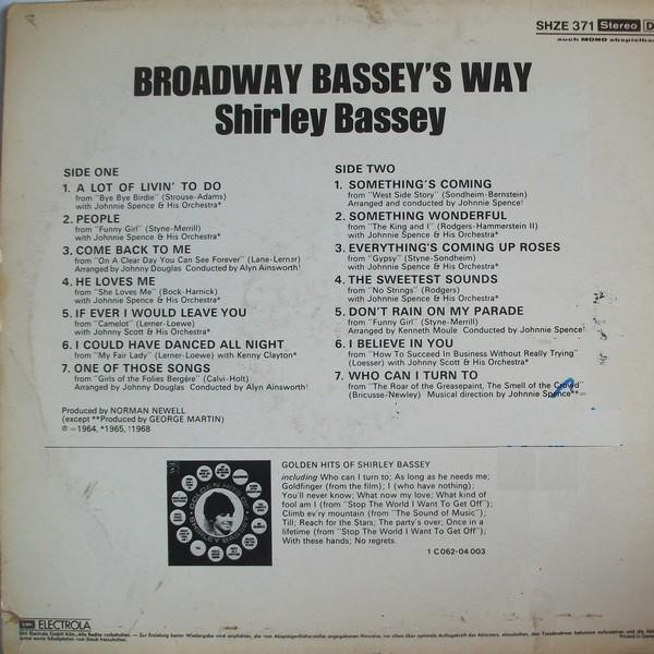€ 9.50 Media: Near Mint (NM or M-)Hoes: Very Good Plus (VG+)Shirley Bassey – Broadway Bassey’s Way (LP, Comp)