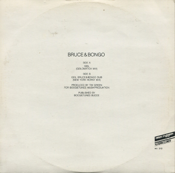 € 6.50 Media: Very Good Plus (VG+)Hoes: Very Good Plus (VG+)Bruce & Bongo – Geil (12″)