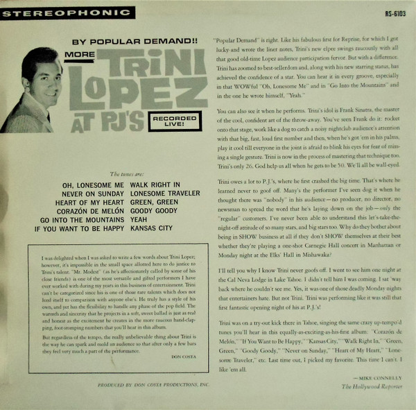 € 11.50 Media: Very Good Plus (VG+)Hoes: Very Good Plus (VG+)Trini Lopez – By Popular Demand More Trini Lopez At P.J.’s (LP, Album, RE)