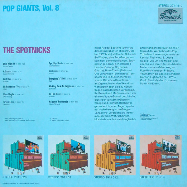 € 5.00 Media: Very Good (VG)Hoes: Very Good Plus (VG+)The Spotnicks – Pop Giants, Vol. 8 (LP, Comp)