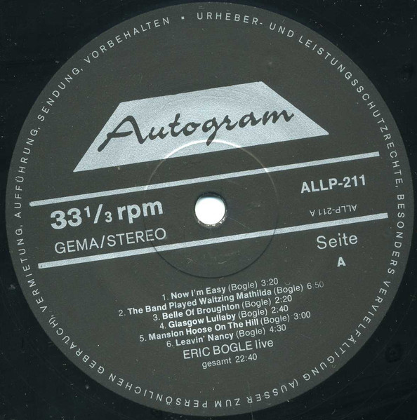 € 5.00 Media: Very Good (VG)Hoes: Very Good Plus (VG+)Eric Bogle – Live In Person (LP, Album)