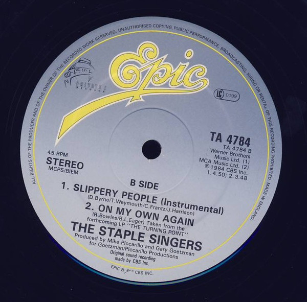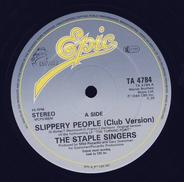 € 6.50 Media: Very Good Plus (VG+)Hoes: Very Good Plus (VG+)The Staple Singers – Slippery People (12″, Single, Com)