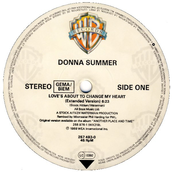 € 7.50 Media: Near Mint (NM or M-)Hoes: Very Good Plus (VG+)Donna Summer – Love’s About To Change My Heart (12″, Maxi)