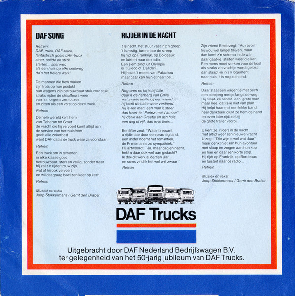 € 4.00 Media: Very Good (VG)Hoes: Very Good Plus (VG+)Peter Blanker / Thérèse Steinmetz – DAF Song / Rijder In De Nacht (7″, Single)