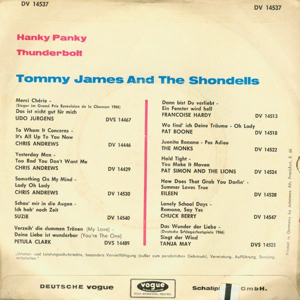 € 3.00 Media: Good Plus (G+)Hoes: Very Good Plus (VG+)Tommy James & The Shondells – Hanky Panky (7″, Single)