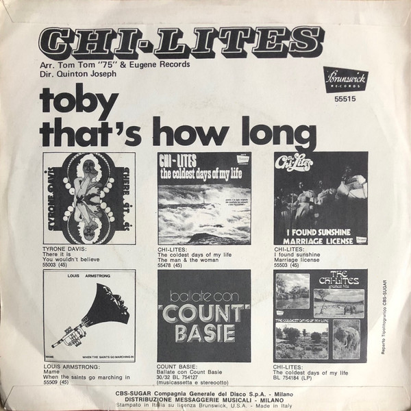 € 3.00 Media: Very Good (VG)Hoes: Very Good (VG)The Chi-Lites – Toby / That’s How Long (7″, Single)