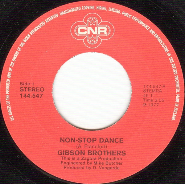 € 3.00 Media: Very Good (VG)Hoes: Very Good Plus (VG+)Gibson Brothers – Non Stop Dance (7″)