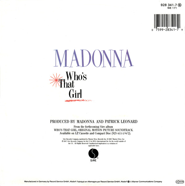 € 10.00 Media: Very Good (VG)Hoes: Very Good Plus (VG+)Madonna – Who’s That Girl (7″, Single)
