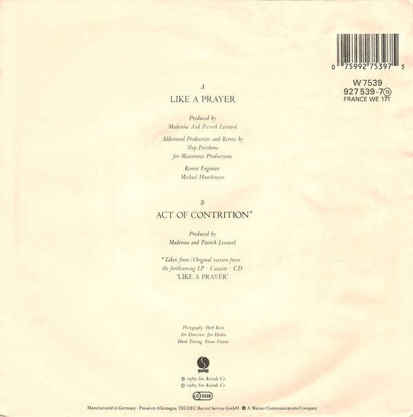 € 4.00 Media: Very Good Plus (VG+)Hoes: Very Good Plus (VG+)Madonna – Like A Prayer (7″, Single, Lar)