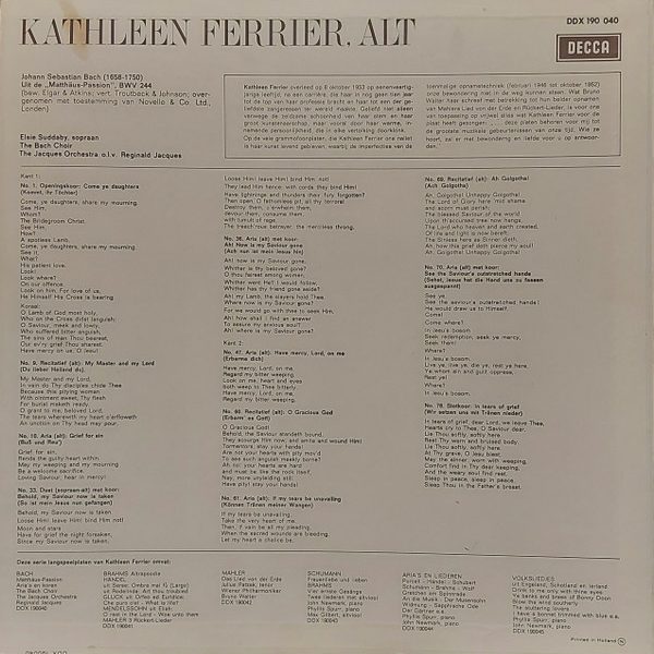 € 3.00 Media: Good (G)Hoes: Good Plus (G+)Bach* – Kathleen Ferrier, The Jacques Orchestra, Reginald Jacques, The Bach Choir – Matthäus-Passion, Aria’s En Koren (LP, Mono)