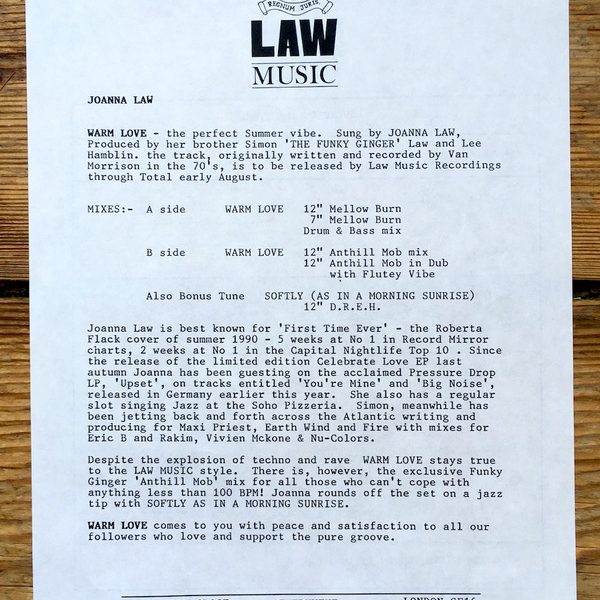 € 6.00 Media: Very Good Plus (VG+)Hoes: Very Good (VG)Joanna Law – Warm Love 92 (12″, W/Lbl)