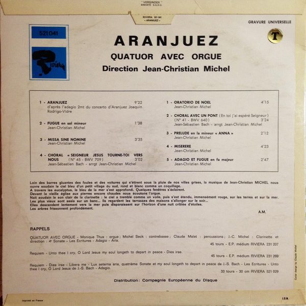 € 9.00 Media: Very Good Plus (VG+)Hoes: Very Good Plus (VG+)Jean-Christian Michel – Quatuor Avec Orgue – Aranjuez (LP)