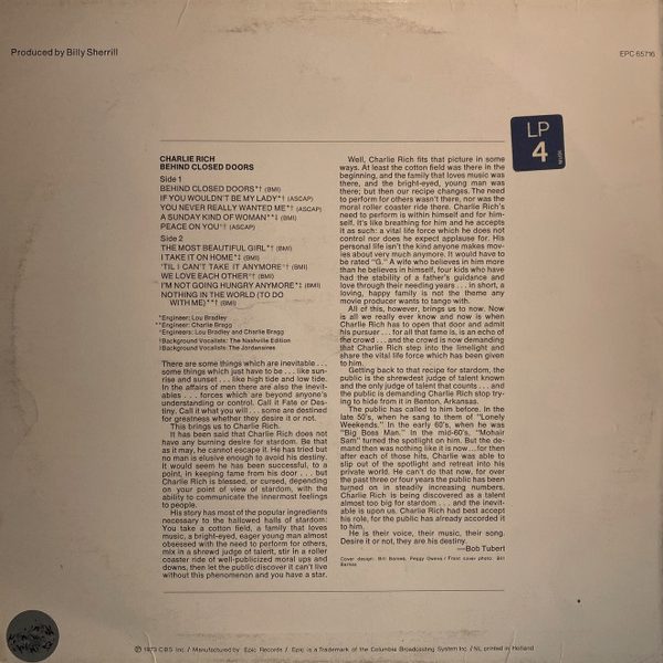 € 7.00 Media: Very Good Plus (VG+)Hoes: Very Good Plus (VG+)Charlie Rich – Behind Closed Doors (LP, Album)
