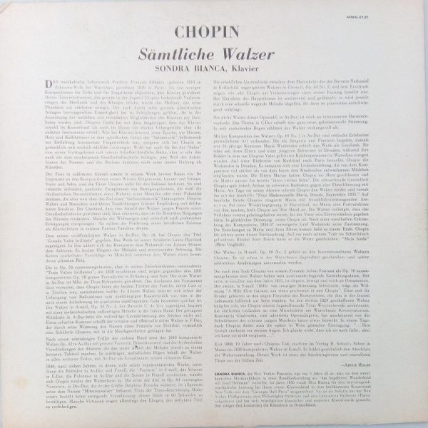 € 3.00 Media: Good Plus (G+)Hoes: Very Good (VG)Chopin* – Sondra Bianca – Sämtliche Walzer (LP, Mono)
