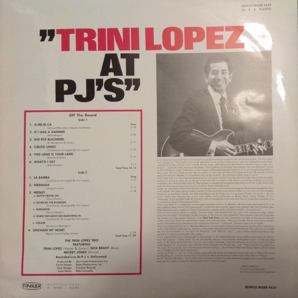 € 8.50 Media: Very Good Plus (VG+)Hoes: Very Good Plus (VG+)The Trini Lopez Trio – Trini Lopez At PJ’s (LP, Album)