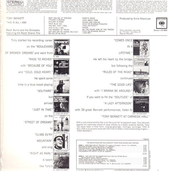 € 7.50 Media: Near Mint (NM or M-)Hoes: Very Good Plus (VG+)Tony Bennett – This Is All I Ask (LP, Album, Ter)