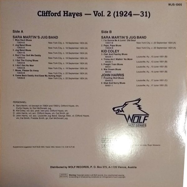 € 9.00 Media: Very Good Plus (VG+)Hoes: Very Good Plus (VG+)Clifford Hayes – Vol. 2 (1924-31) The Complete Recordings In Chronological Order Of Sarah Martin’s Jug Band, Kid Coley, John Harris. (LP, Comp)