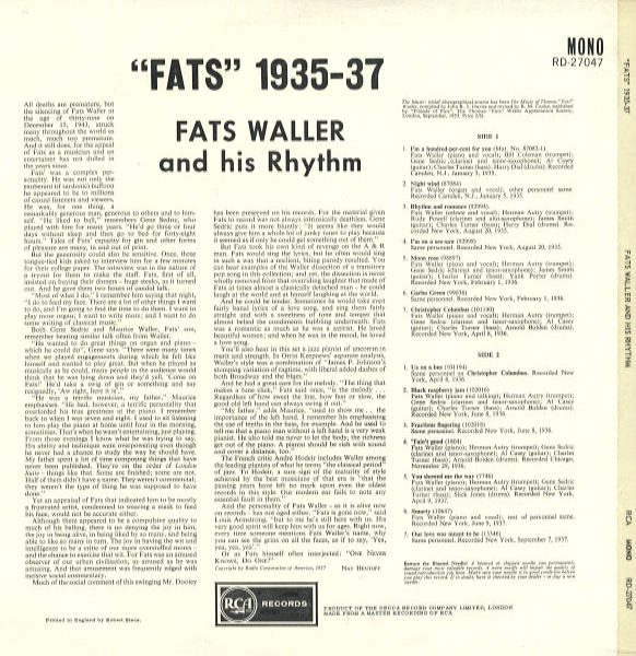 € 8.00 Media: Very Good Plus (VG+)Hoes: Very Good Plus (VG+)Fats Waller – “Fats” 1935-37 (LP, Comp, Mono)