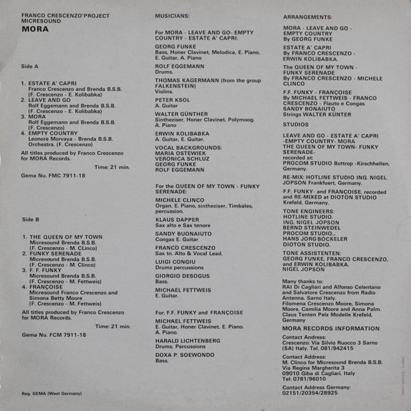 € 12.00 Media: Very Good Plus (VG+)Hoes: Very Good Plus (VG+)Franco Crescenzo’ Project Micresound – Mora / Love, Hurt And Fire (LP)