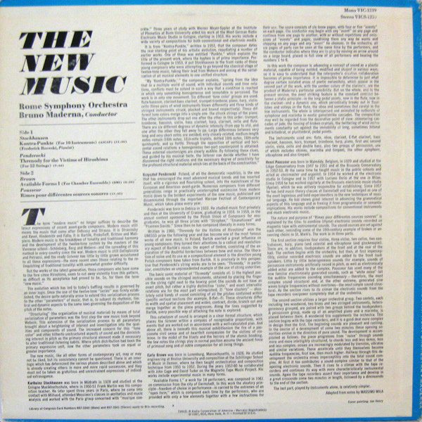 € 8.50 Media: Very Good Plus (VG+)Hoes: Very Good Plus (VG+)Karlheinz Stockhausen / Krzysztof Penderecki / Earle Brown / Henri Pousseur, Rome Symphony Orchestra* / Bruno Maderna – The New Music (LP)