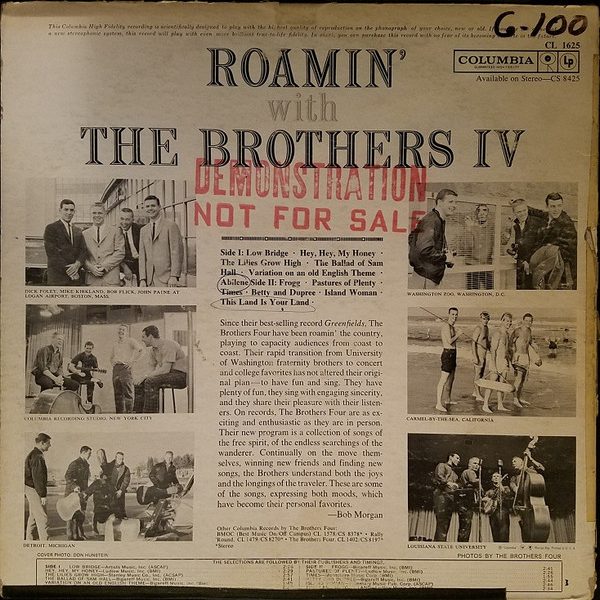 € 5.00 Media: Very Good (VG)Hoes: Very Good (VG)The Brothers IV* – Roamin’ (LP, Album, Mono)