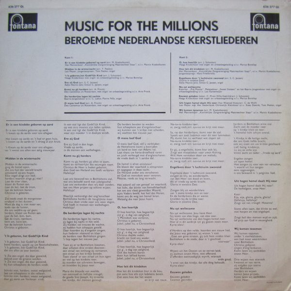 € 8.50 Media: Very Good Plus (VG+)Hoes: Very Good Plus (VG+)Various – Music For The Millions: Beroemde Nederlandse Kerstliederen (LP, Comp, Mono)
