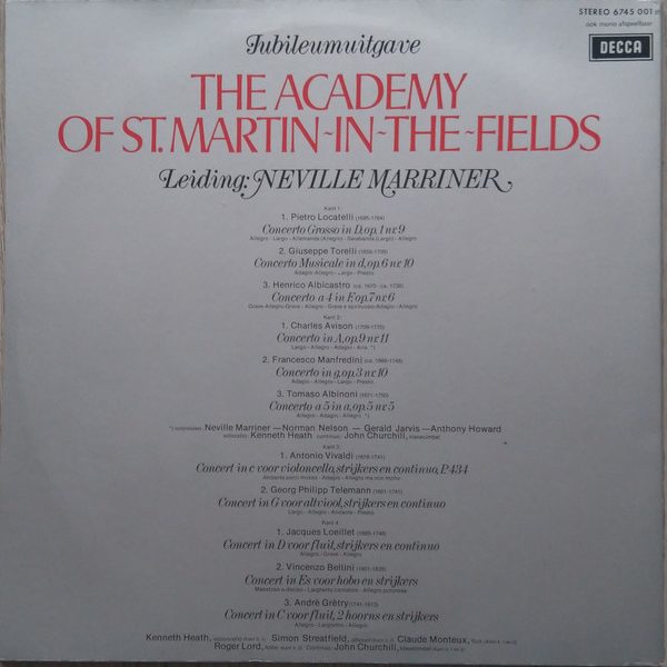 € 8.50 Media: Very Good Plus (VG+)Hoes: Very Good Plus (VG+)The Academy Of St. Martin-in-the-Fields, Neville Marriner* – Jubileumuitgave – 12½ Jaar – Concerti Grossi En Soloconcerten Van Locatelli-Torelli-Albicastro-Avison-Manfredini-Albinoni-Vivaldi-Telemann-Loeillet-Bellini-Grétry (2xLP, Comp)