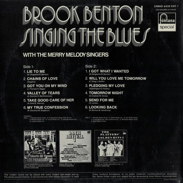 € 2.50 Media: Fair (F)Hoes: Good Plus (G+)Brook Benton – Singing The Blues (LP, Album, RE)