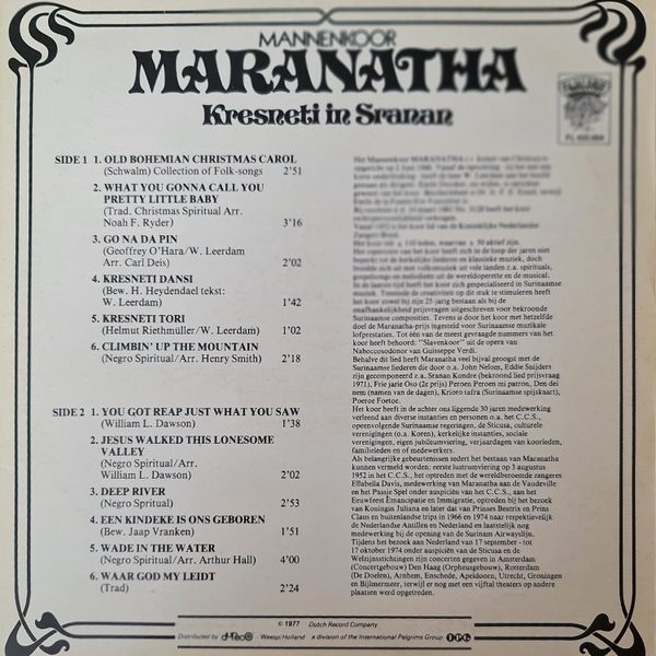 € 4.50 Media: Very Good (VG)Hoes: Good Plus (G+)Mannenkoor Maranatha – Kresneti In Sranan (LP)