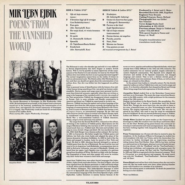 € 6.50 Media: Very Good (VG)Hoes: Very Good (VG)Jacqueline Reisel – Mir Lebn Ejbik Poems From The Vanished World (Songs In Yiddish & Ladino · 2) (LP)